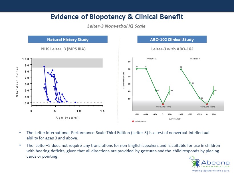 Evidence of Biopotency & Clinical Benefit Natural History Study ABO - 102 Clinical Study Leiter - 3 Nonverbal IQ Scale • The Leiter International Performance Scale Third Edition (Leiter - 3) is a test of nonverbal intellectual ability for ages 3 and above. • The Leiter – 3 does not require any translations for non English speakers and is suitable for use in children with hearing deficits, given that all directions are provided by gestures and the child responds by placing cards or pointing. Leiter - 3 with ABO - 102 NHS Leiter – 3 (MPS IIIA)