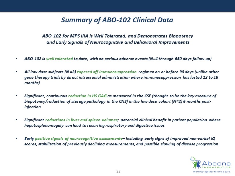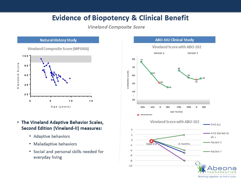 Evidence of Biopotency & Clinical Benefit Natural History Study ABO - 102 Clinical Study Vineland Composite Score (MPSIIIA) Vineland Score with ABO - 102 Vineland Score with ABO - 102 • The Vineland Adaptive Behavior Scales, Second Edition (Vineland - II) measures : • A daptive behaviors • M aladaptive behaviors • Social and personal skills needed for everyday living Vineland Composite Score 0 - 5 0 - 5 0 - 8 0 - 4 0 2 -10 -8 -6 -4 -2 0 2 4 Baseline 6 months NHS ALL NHS Started at 45 + Patient X Patient Y