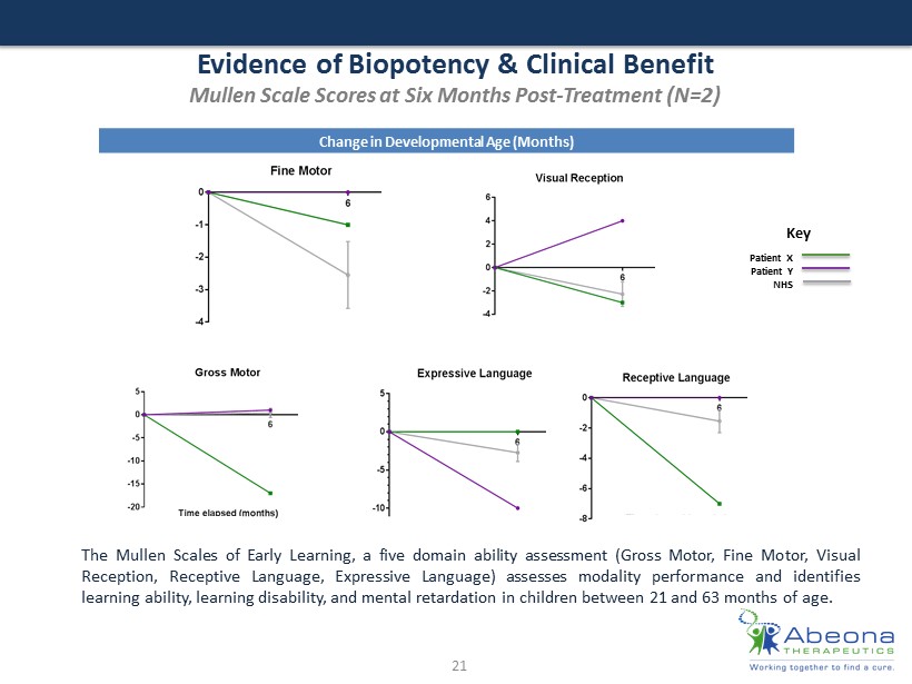 Evidence of Biopotency & Clinical Benefit Mullen Scale Scores at Six Months Post - Treatment (N=2) 21 The Mullen Scales of Early Learning, a five domain ability assessment ( Gross Motor , Fine Motor, Visual Reception, Receptive Language, Expressive Language) assesses modality performance and identifies learning ability, learning disability, and mental retardation in children between 21 and 63 months of age . Change in Developmental Age (Months) Patient X Patient Y NHS Key