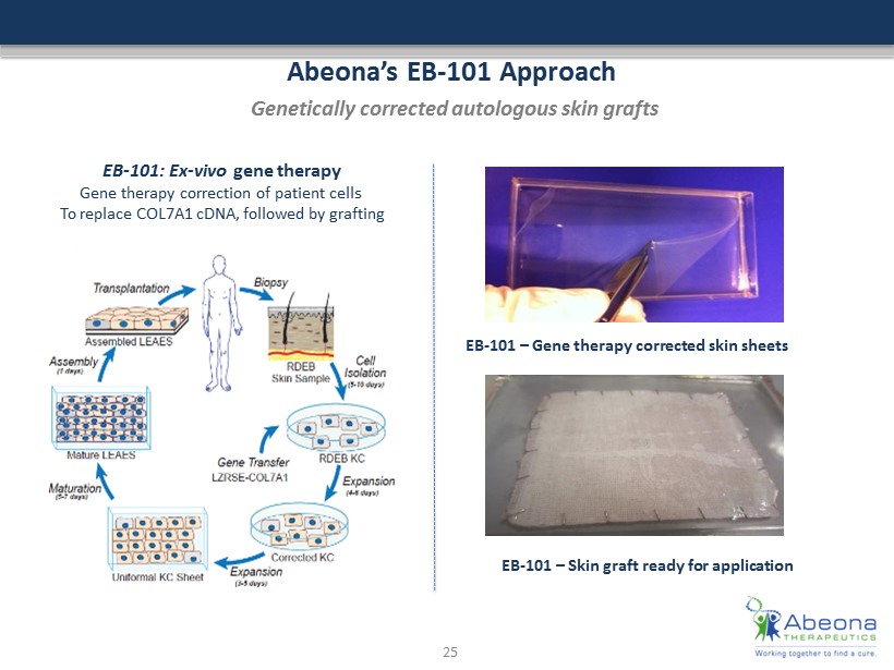 Epidermolysis Bullosa (EB) Rare and devastating skin disease Group of devastating inherited connective tissue diseases; characterized by skin blisters and erosions that can also affect internal organs • There are four forms of EB; EB - 101 targets Recessive Dystrophic Epidermolysis Bullosa (RDEB), an extremely rare form of EB, which is caused by the absence of the COL7A1 gene (encodes type 7 collagen fibril that anchors skin to the underlying stroma) • RDEB is the most severe form and is characterized by severe blistering, open wounds, and scarring in response to minor friction to skin No FDA approved therapies currently available • Prevalence of EB is estimated to be 30,000 - 40,000 of which RDEB is estimated to be 2,500 - 3,000 in the US alone • With no FDA approved treatments, any reduction in disease symptoms or improvements in wound healing could be considered clinically meaningful Ongoing clinical trial • Conducted at Stanford University School of Medicine • Phase 1 completed; strong 12 - month post treatment data on initial 4 patients • Phase 2 trial: enrolling patients 24