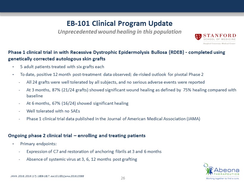 Abeona’s EB - 101 Approach Genetically corrected autologous skin grafts EB - 101: Ex - vivo gene therapy Gene therapy correction of patient cells To replace COL7A1 cDNA , followed by grafting EB - 101 – Gene therapy corrected skin sheets EB - 101 – Skin graft ready for application 25