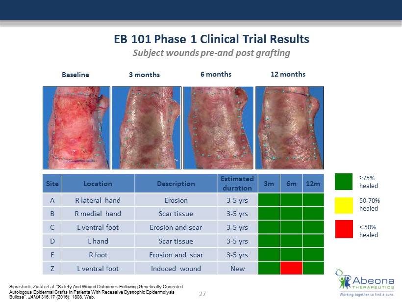 EB - 101 Clinical Program Update Unprecedented wound healing in this population Phase 1 clinical trial in with Recessive Dystrophic Epidermolysis Bullosa (RDEB) - completed using genetically corrected autologous skin grafts • 5 adult patients treated with six grafts each • To date, positive 12 month post - treatment data observed; de - risked outlook for pivotal Phase 2 - All 24 grafts were well tolerated by all subjects, and no serious adverse events were reported - At 3 months, 87% (21/24 grafts) showed significant wound healing as defined by 75% healing compared with baseline - At 6 months, 67% (16/24) showed significant healing - Well tolerated with no SAEs - Phase 1 clinical trial data published in the Journal of American Medical Association (JAMA) Ongoing phase 2 clinical trial – enrolling and treating patients • Primary endpoints: - Expression of C7 and restoration of anchoring fibrils at 3 and 6 months - Absence of systemic virus at 3, 6, 12 months post grafting 26 JAMA. 2016; 2016 (17): 1808 - 1817. doi:10.1001/jama.2016.15588