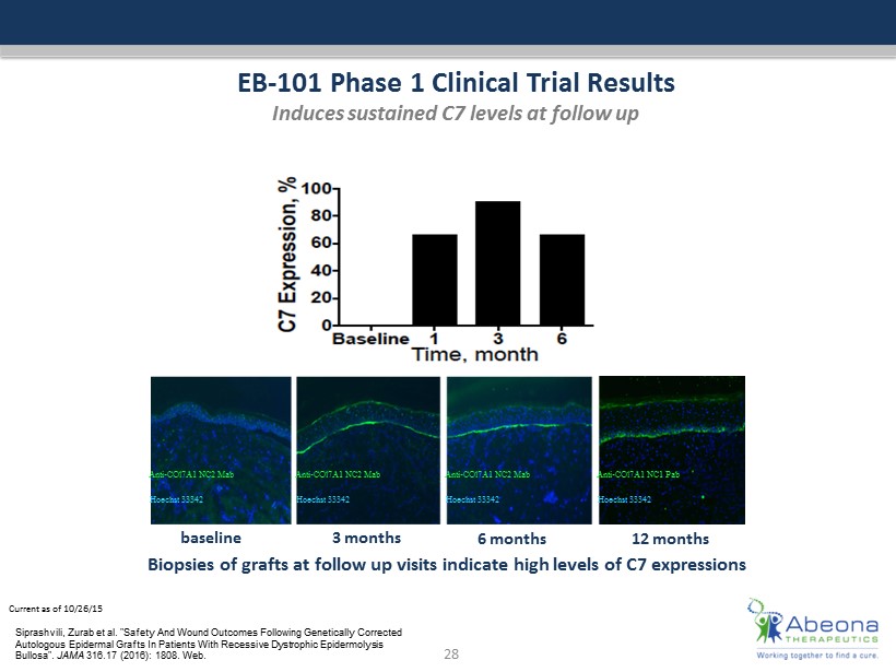 Current as of 10/26/15 EB - 101 Phase 1 Clinical Trial Results Induces sustained C7 levels at follow up Biopsies of grafts at follow up visits indicate high levels of C7 expressions Anti - COl7A1 NC2 Mab Hoechst 33342 Anti - COl7A1 NC2 Mab Hoechst 33342 Anti - COl7A1 NC2 Mab Hoechst 33342 Anti - COl7A1 NC1 Pab Hoechst 33342 28 baseline 3 months 6 months 12 months Siprashvili , Zurab et al. "Safety And Wound Outcomes Following Genetically Corrected Autologous Epidermal Grafts In Patients With Recessive Dystrophic Epidermolysis Bullosa". JAMA 316.17 (2016): 1808. Web.