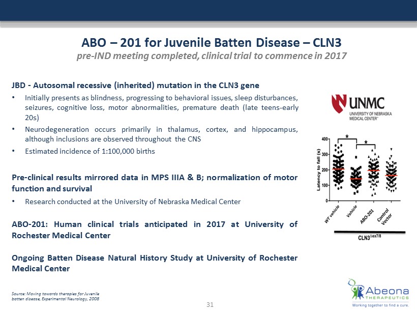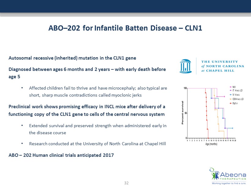 ABO – 201 for Juvenile Batten Disease – CLN3 pre - IND meeting completed, clinical trial to commence in 2017 Source: Moving towards therapies for Juvenile batten disease, Experimental Neurology, 2008 JBD - Autosomal recessive (inherited) mutation in the CLN 3 gene • Initially presents as blindness, progressing to behavioral issues, sleep disturbances, seizures, cognitive loss, motor abnormalities, premature death (late teens - early 20 s) • Neurodegeneration occurs primarily in thalamus, cortex, and hippocampus, although inclusions are observed throughout the CNS • Estimated incidence of 1 : 100 , 000 births Pre - clinical results mirrored data in MPS IIIA & B ; normalization of motor function and survival • Research conducted at the University of Nebraska Medical Center ABO - 201 : Human clinical trials anticipated in 2017 at University of Rochester Medical Center Ongoing Batten Disease Natural History Study at University of Rochester Medical Center 31