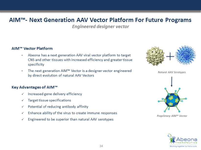 AIM™ - Next Generation AAV Vector Platform For Future Programs AIM™ Vector Platform • Abeona has a next generation AAV viral vector platform to target CNS and other tissues with increased efficiency and greater tissue specificity • The next generation AIM™ Vector is a designer vector engineered by direct evolution of natural AAV Vectors Key Advantages of AIM™ x Increased gene delivery efficiency x Target tissue specifications x Potential of reducing antibody affinity x Enhance ability of the virus to create immune responses x Engineered to be superior than natural AAV serotypes Engineered designer vector Proprietary AIM™ Vector Natural AAV Serotypes 34