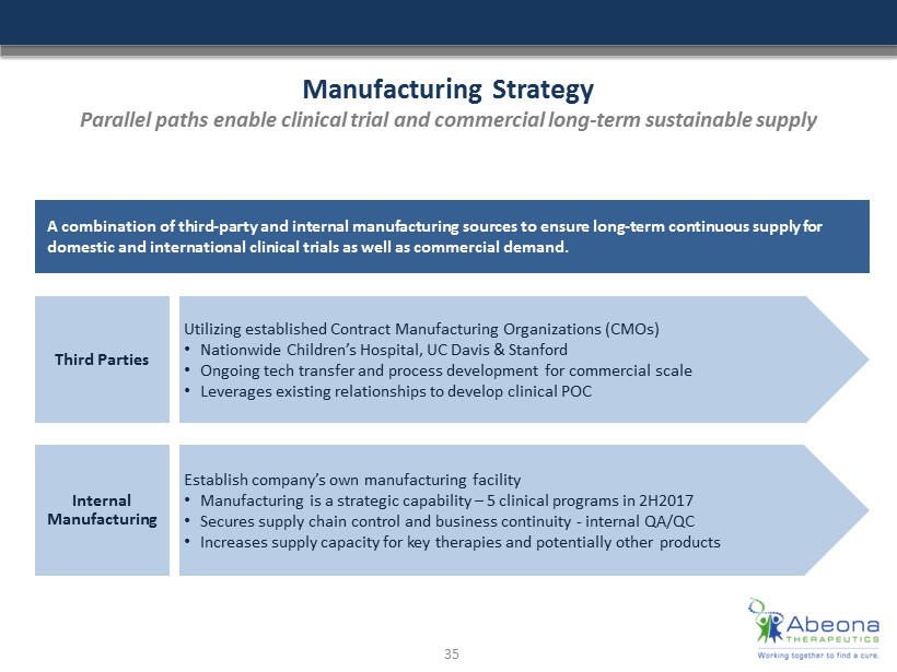Manufacturing Strategy Parallel paths enable clinical trial and commercial long - term sustainable supply A combination of third - party and internal manufacturing sources to ensure long - term continuous supply for domestic and international clinical trials as well as commercial demand . Third Parties Utilizing established Contract Manufacturing Organizations (CMOs) • Nationwide Children’s Hospital, UC Davis & Stanford • Ongoing tech transfer and process development for commercial scale • Leverages existing relationships to develop clinical POC Internal Manufacturing Establish company’s own manufacturing facility • Manufacturing is a strategic capability – 5 clinical programs in 2H2017 • Secures supply chain control and business continuity - internal QA/QC • Increases supply capacity for key therapies and potentially other products 35