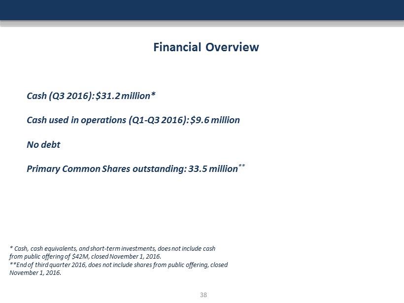 Financial Overview Cash (Q3 2016): $31.2 million* Cash used in operations ( Q1 - Q3 2016 ): $9.6 million No debt Primary Common S hares outstanding: 33.5 million ** 38 * Cash, cash equivalents, and short - term investments, does not include cash from public offering of $42M, closed November 1, 2016. **End of third quarter 2016, does not include shares from public offering, closed November 1, 2016.