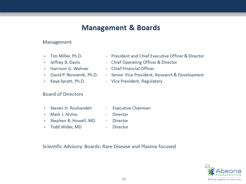 Investment Highlights A World Leader in Rare Disease Therapies Strategic Focus on Rare Diseases • Substantial unmet medical need to treat life threatening diseases caused by a defect in a single gene • Most advanced programs in neurological / lysosomal storage diseases where there are no treatment options • Orphan and Rare pediatric disease focus: shorter route to approval, and lower costs • Opportunity to secure Priority Review Voucher (PRV) for rare pediatric diseases Three Clinical Programs in Phase I/II • ABO - 102: Sanfilippo syndrome Type A – MPS IIIA. Lysosomal storage disease affecting children. • ABO - 101 : Sanfilippo syndrome Type B – MPS IIIB. Lysosomal storage disease affecting children. • EB - 101 : Recessive dystrophic epidermolysis bullosa (RDEB ). Severely fragile skin disease affecting children. Robust Pipeline With Multiple Therapies Soon Entering the Clinic • Based on strong pre - clinical results, two additional programs are expected to begin Phase I/II by the end of 2017 including: – ABO - 201: Juvenile Batten disease (CLN3) – ABO - 202: Infantile Batten disease (CLN1) Proprietary Vector Platform For New Product Development • 60+ proprietary AAV vectors that uniquely enable the delivery of genes across the blood brain barrier making IV administration possible • Next generation chimera vector platform in development with increased gene delivery efficiency, reduced antibody affinity, enhanced ability to create immune responses and target tissue specifications Several Catalysts will Drive Significant Near Term Value • Achieve fast track designation for additional programs • Initiate high dose cohort in ABO - 102 for MPS IIIA • Initiate and enroll 1 st patient in ABO - 101 for MPS IIIB Phase 1/2 clinical studies • Dose adolescents in EB - 101 trial; secure orphan drug and rare pediatric disease designations 39