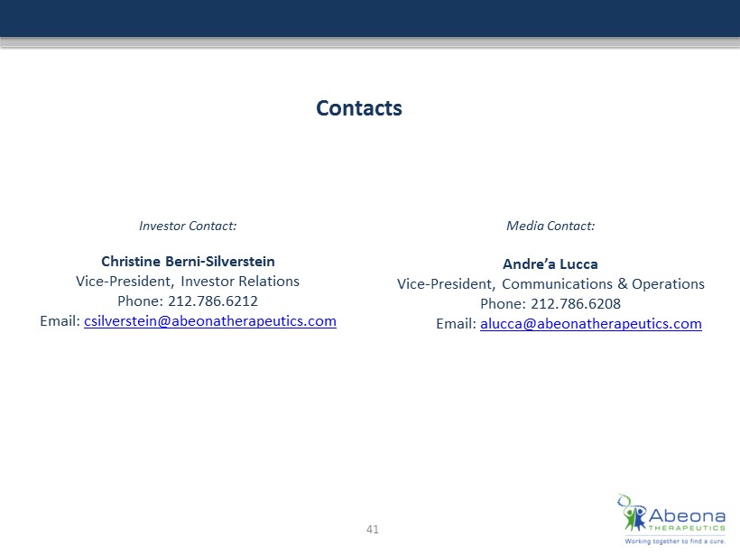 Contacts 41 Investor Contact: Christine Berni - Silverstein Vice - President, Investor Relations Phone: 212.786.6212 Email: csilverstein@abeonatherapeutics.com Media Contact: Andre’a Lucca Vice - President, Communications & Operations Phone: 212.786.6208 Email: alucca@abeonatherapeutics.com
