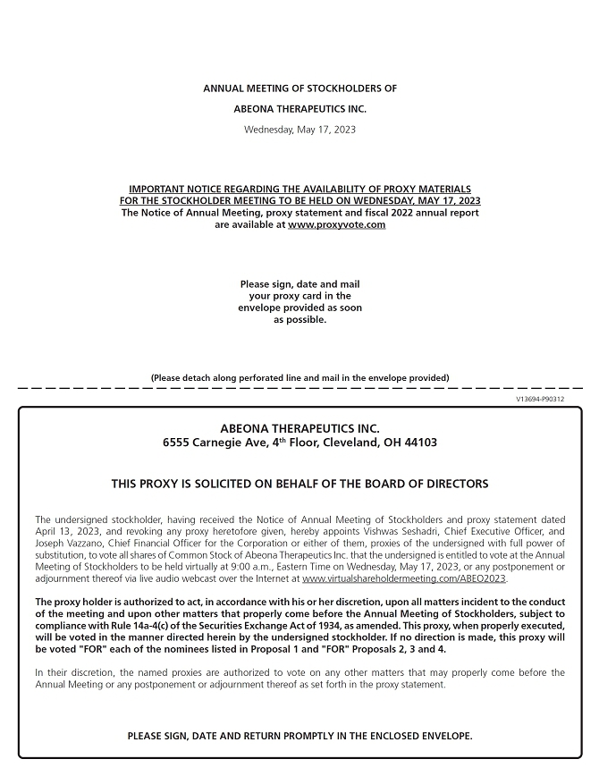 You are cordially invited to attend the Annual Meeting of Stockholders (the “Annual Meeting”) of Abeona Therapeutics Inc. (the “Company”) to be held virtually on Wednesday, May 17, 2023 at 9:00 a.m., Eastern Time. Our Annual Meeting will be held in a virtual format only. You will be able to attend the Annual Meeting, vote and submit your questions during the Annual Meeting via a live webcast through the link www.virtualshareholdermeeting.com/ABEO2023.