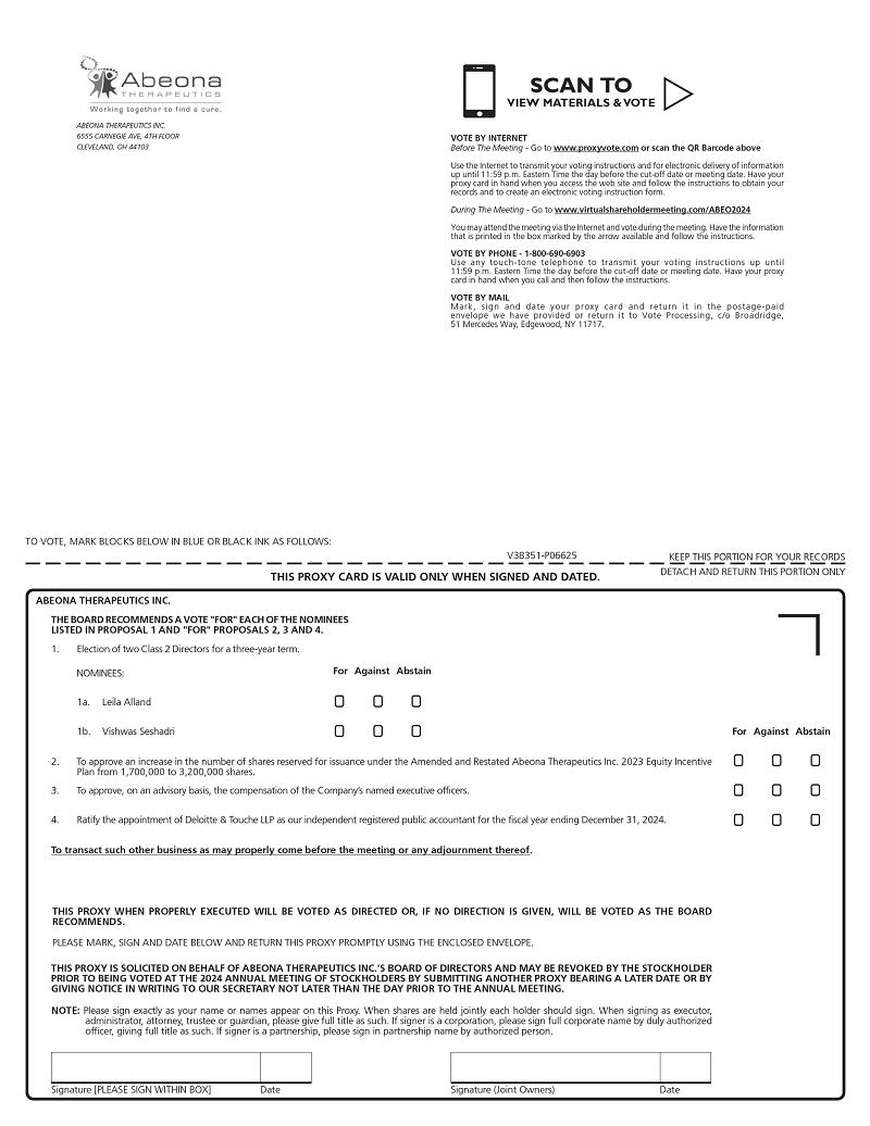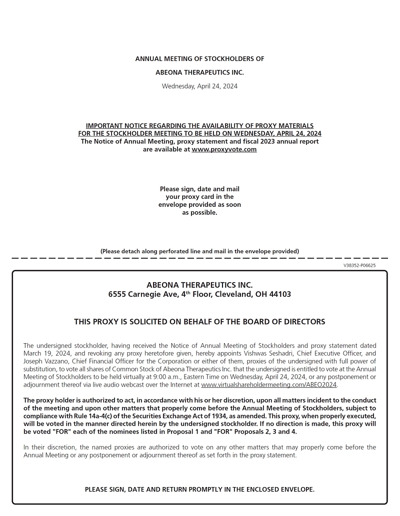 You are cordially invited to attend the Annual Meeting of Stockholders (the “Annual Meeting”) of Abeona Therapeutics Inc. (the “Company”) to be held virtually on Wednesday, April 24, 2024 at 9:00 a.m., Eastern Time. Our Annual Meeting will be held in a virtual format only. You will be able to attend the Annual Meeting, vote and submit your questions during the Annual Meeting via a live webcast through the link www.virtualshareholdermeeting.com/ABEO2024.