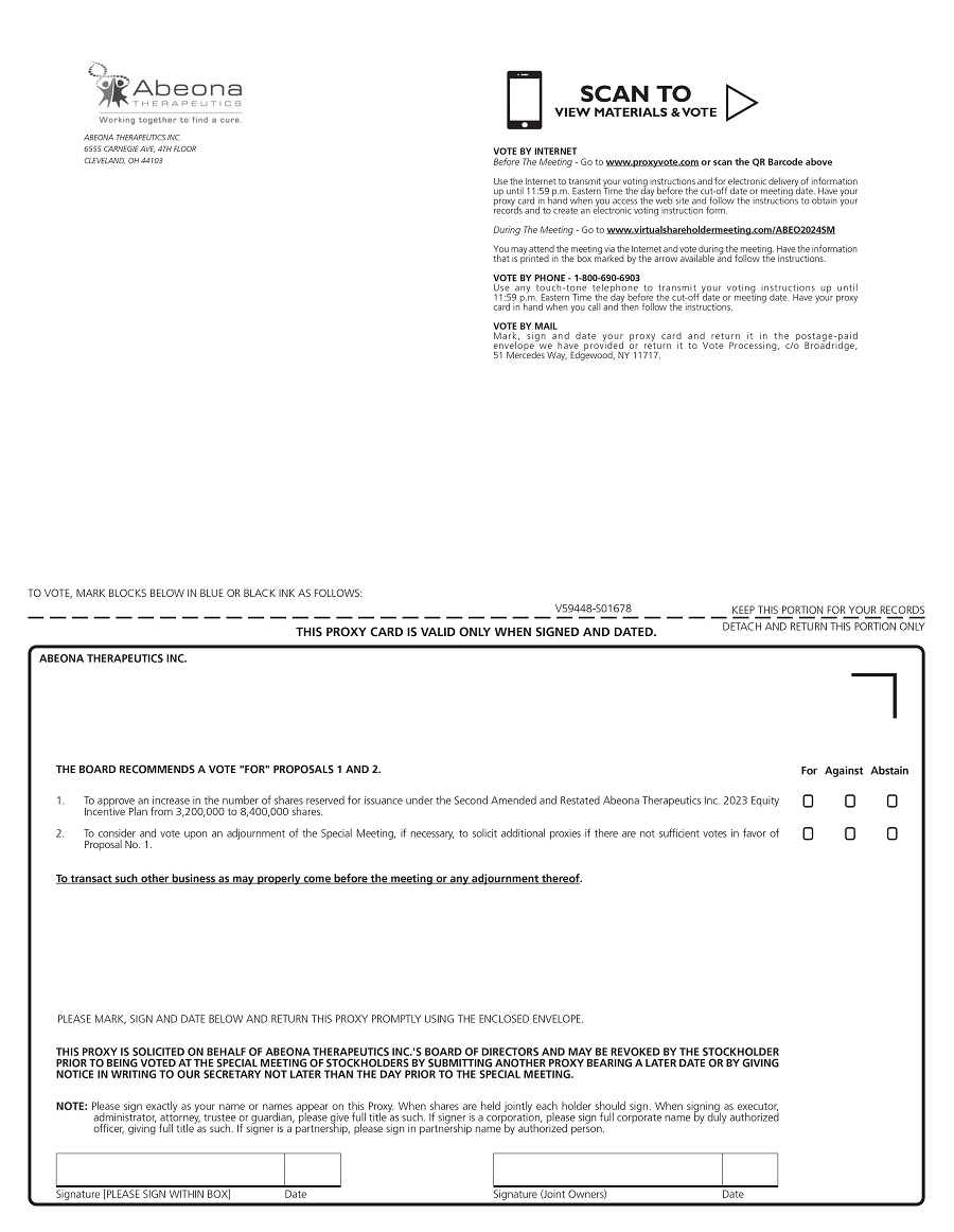 Stockholders are invited to attend the Special Meeting to be held virtually over the Internet on Friday, December 20, 2024 at 9 a.m. Eastern Time. YOUR VOTE IS IMPORTANT. If you do not expect to virtually attend the Special Meeting, or if you do plan to virtually attend but wish to vote by proxy, please complete, date, sign and mail the enclosed proxy card in the return envelope provided addressed to Vote Processing, c/o Broadridge, 51 Mercedes Way, Edgewood, NY 11717. Proxies will also be accepted as follows: (1) via the Internet by accessing www.proxyvote.com and following the on-screen instructions or scanning the QR code on the proxy card with your smartphone; (2) by calling toll-free at 1-800-690-6903 from any touch-tone telephone and following the instructions; (3) by signing, dating and returning your proxy card in the prepaid enclosed envelope and (4) by attending the virtual Special Meeting at www.virtualshareholdermeeting.com/ABEO2024SM. You should have your proxy card available in front of you when you log onto the Internet or call. You can vote online or by phone until 11:59 p.m. Eastern Time the day before the Special Meeting.