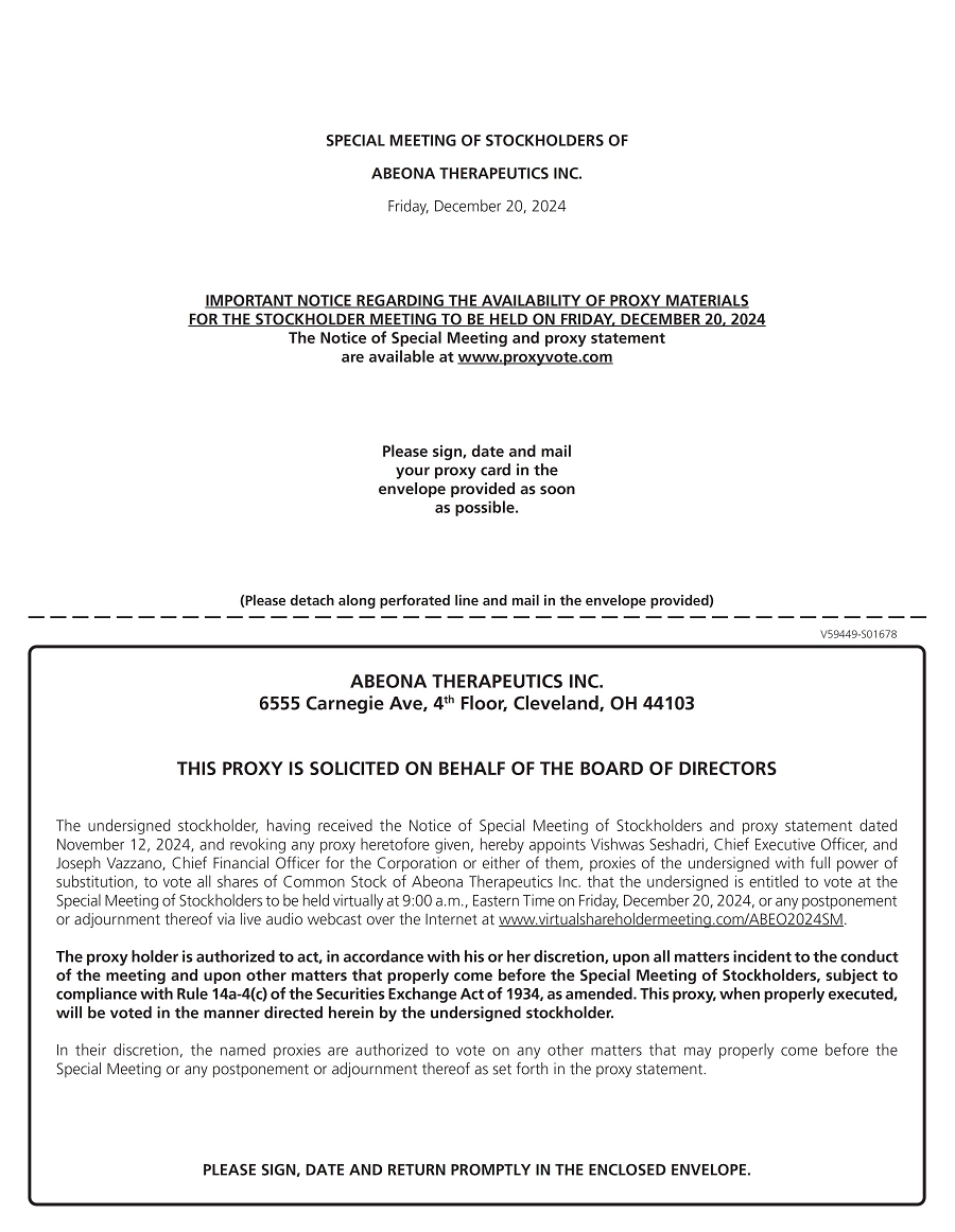 PLEASE TAKE NOTICE that the 2024 Special Meeting of Stockholders (the “Special Meeting”) of Abeona Therapeutics Inc. (the “Company”) will be held virtually over the Internet on Friday, December 20, 2024, at 9:00 a.m. Eastern Time, for the purpose of approving an increase in the number of shares of Common Stock reserved for issuance under the Second Amended and Restated Abeona Therapeutics Inc. 2023 Equity Incentive Plan from 3,200,000 to 8,400,000 shares of Common Stock.