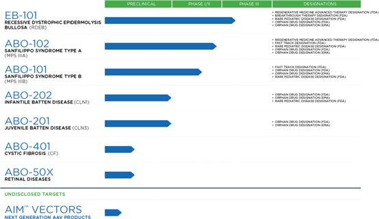 We have three programs in clinical development—EB-101, ABO-101 and ABO-102—and a pipeline of additional earlier stage programs. Our programs are focused on rare serious diseases. Through our gene and cell therapy expertise in research and development, we are positioned to rapidly introduce meaningful therapeutics to transform the standard of care in devastating diseases and establish our leadership position in the field.